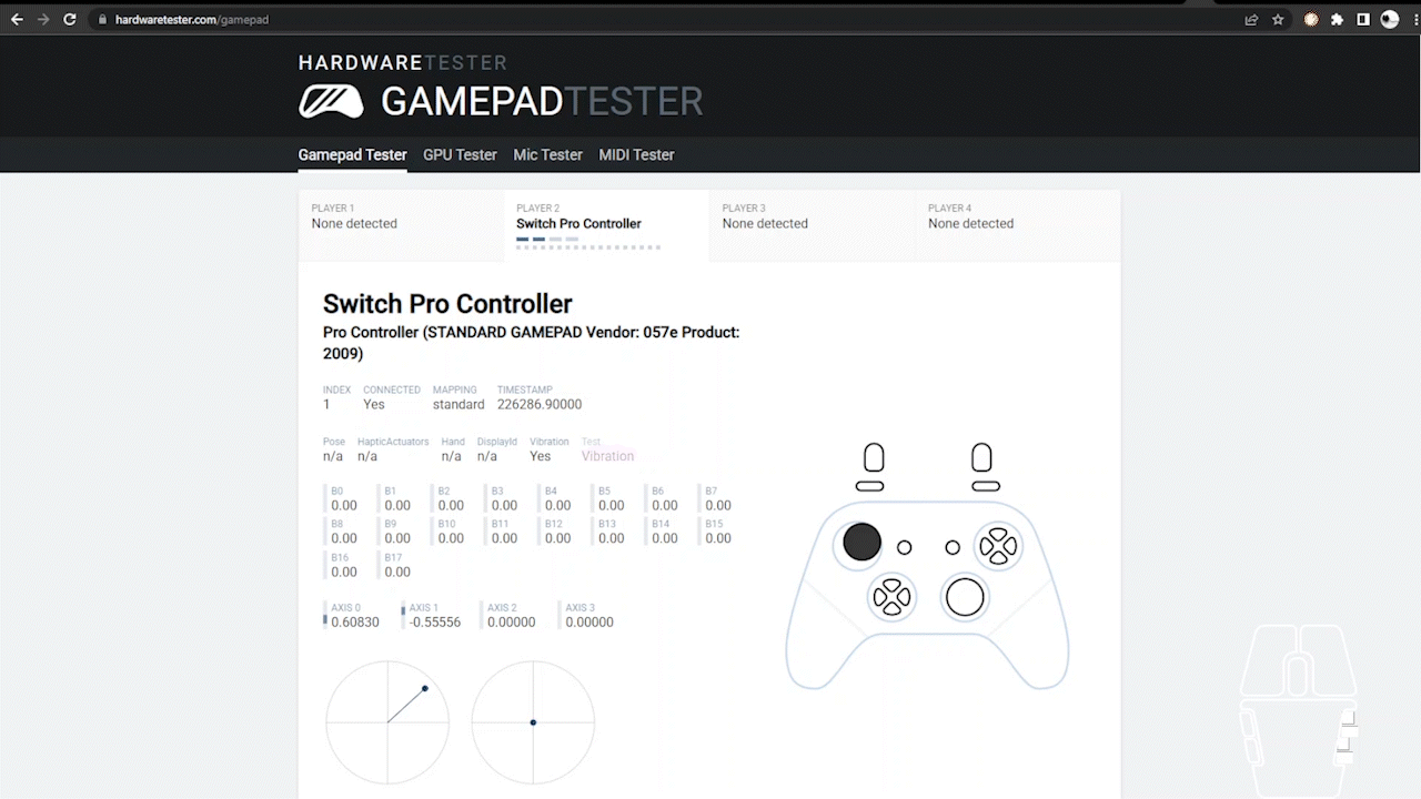 and I tested it using the Hardware tester website: (this same page was also very useful during development to see button mappings).